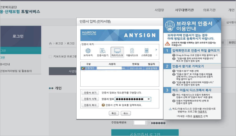 고용보험 가입이력서와 같은 서류를 발급시 공동인증서나 공단전용인증서를 통해 로그인이 가능한데요. 사용장용인증서, 개인인증서, 대표자 인증서 모두 가능합니다.