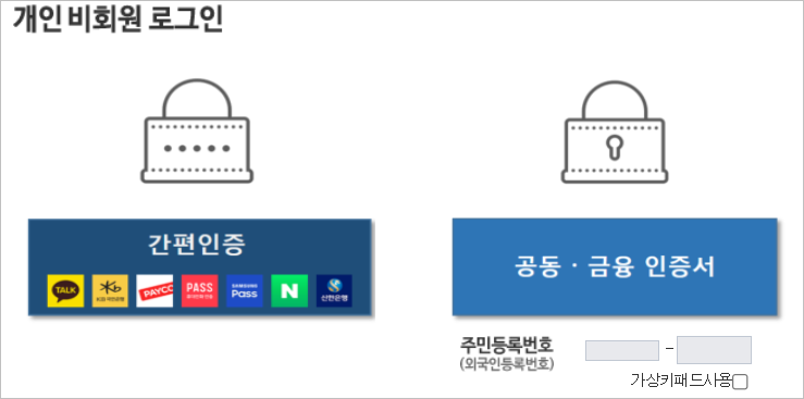 - 간편인증 혹은 공동인증서를 통해 본인인증 후 로그인을 진행해야 합니다.