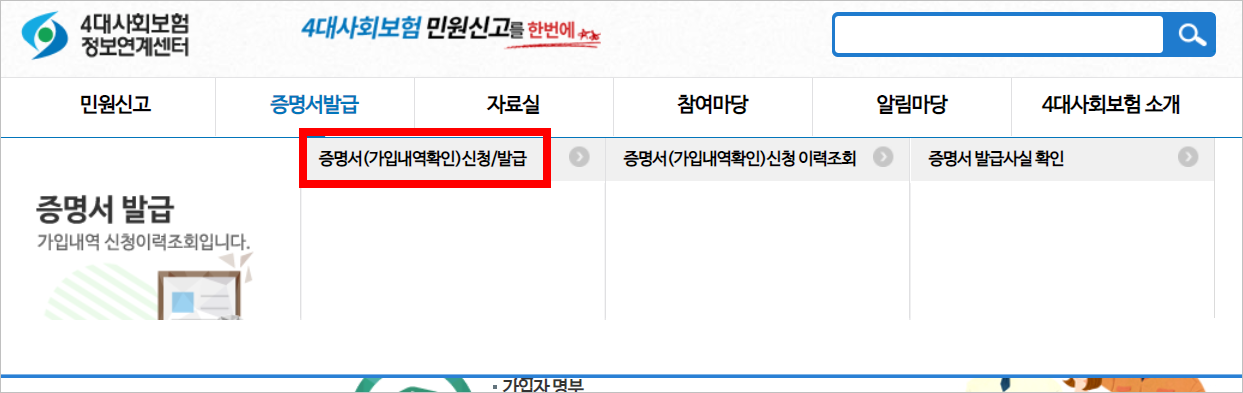 2. 메인메뉴 중 증명서발급 > 증명서(가입내역서확인) 신청/발급 메뉴 선택