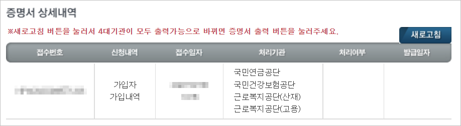 9. 증명서 상세내역화면에서 4대기관이 모두 출력가능으로 바뀌면 출력이 가능합니다. [새로고침]