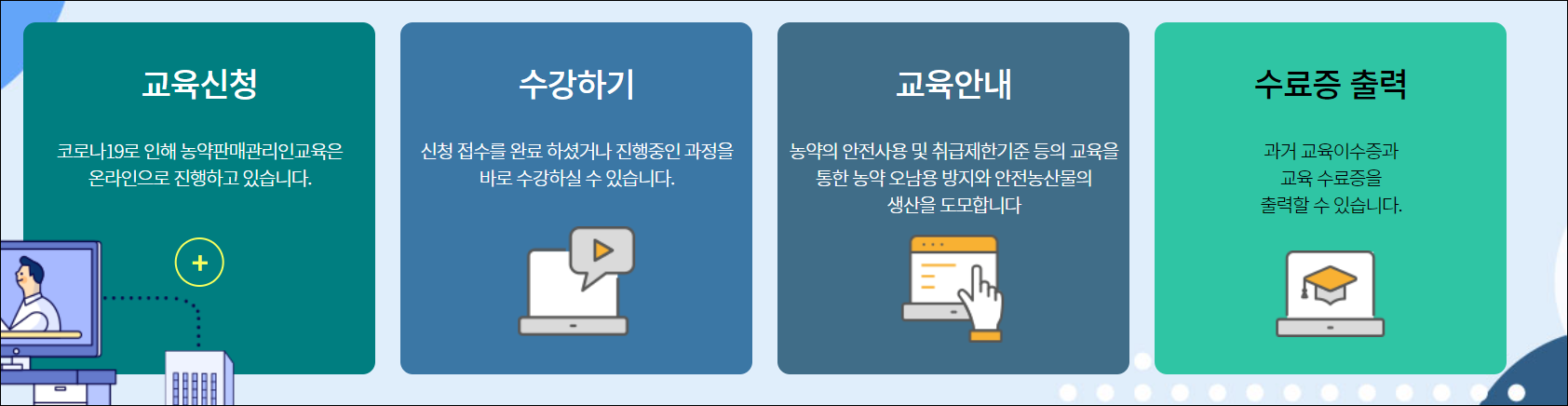 또한 안전한 농약 사용을 위해 판매관리인 교육을 진행중인데요. 온라인으로 진행중이며 신청후 바로 수강할 수 있습니다. 교육 이수 완료후 수료증을 출력할 수 있습니다.