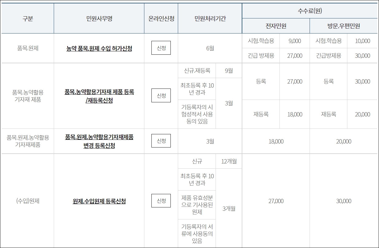 농약등록시 수수료가 발생하는데요. 품목, 원제, 기자재 제품등에 따라 달라지며 수수료는 아래와 같습니다.