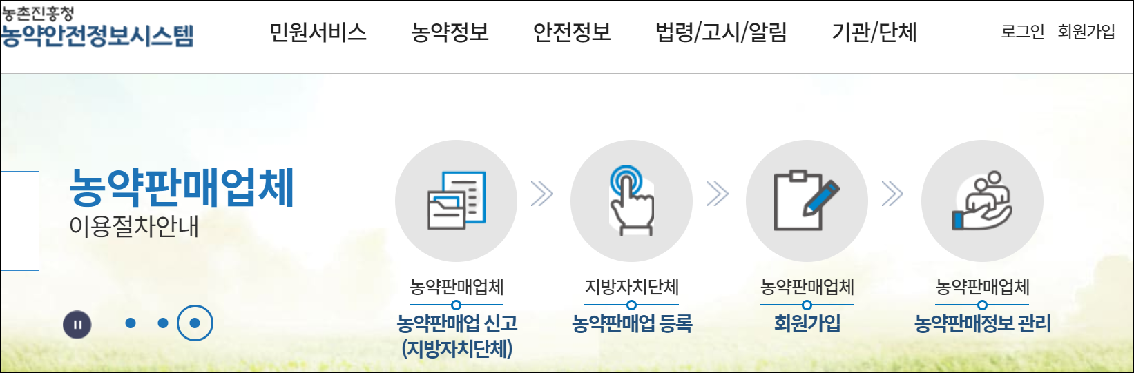 사이트를 통해 농약등록신청, 판매관리인교육, 농약검색등의 농약관련 정보를 얻을 수 있습니다. 농약안전정보시스템 바로가기는 아래와 같습니다.