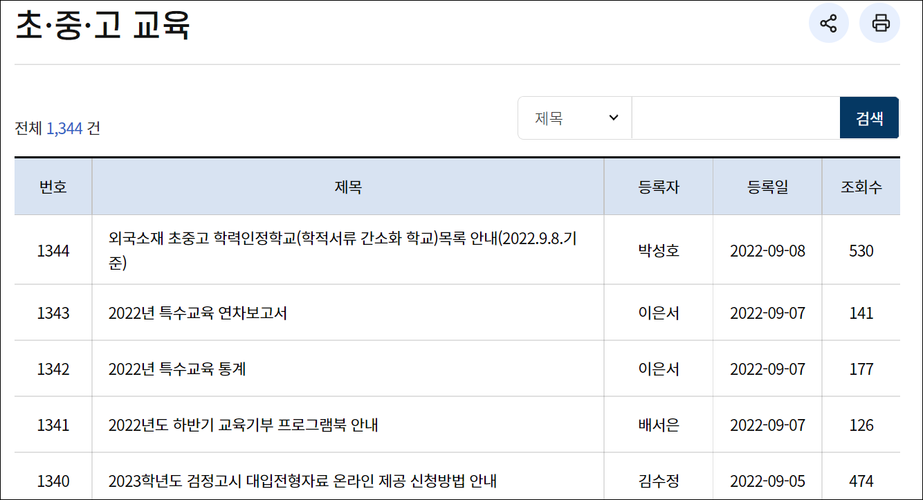 다음으로 초.중.고교 교육인데요. 2022년도 초중고 교육관련한 자료가 올라와 있습니다. 2023학년도 검정고시 대입전형자료 온라인 제공 신청방법도 있네요.
