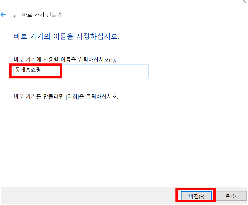 3) 바로가기 이름을 [롯데홈쇼핑]으로 입력후 [마침]을 클릭하세요.