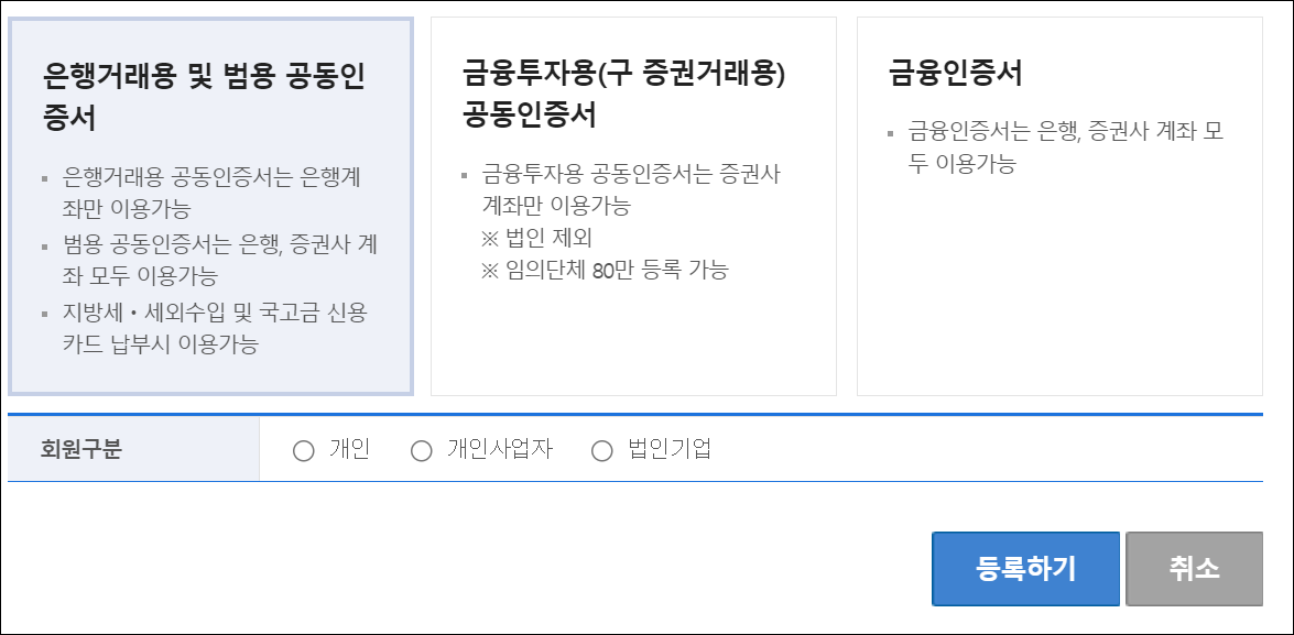 회원정보 입력시 본인확인 방법에서 yessign 외 범용인증서 또는 아이핀 선택시 회원가입 완료후 최초 로그인할때 인증서를 등록해야 합니다.