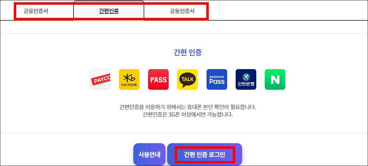 - 금융인증서, 간편인증, 공동인증서 중에서 선택가능합니다.