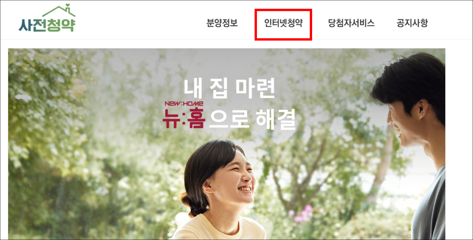 1. 사전청약 홈페이지 접속 후 상단메뉴중 [인터넷청약]을 선택합니다.