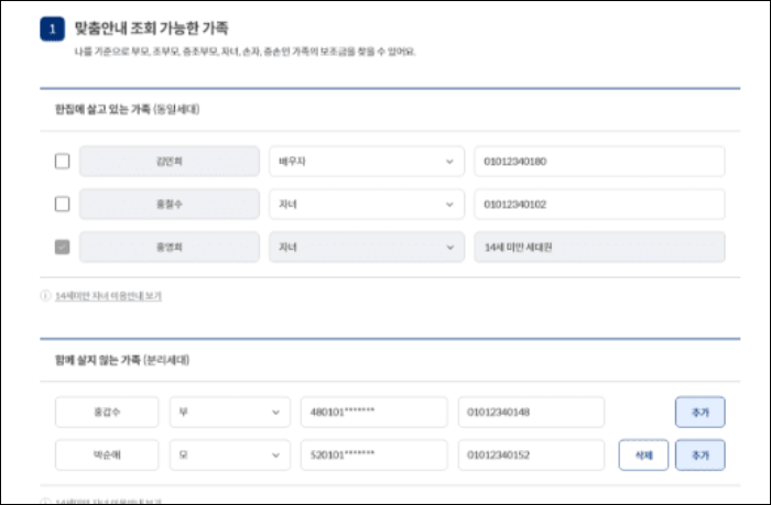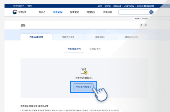3. 가족등록을 원할경우 가족등록 및 추가 > 정보제공동의 > 맞춤안내 지원> 결과 확인을 통해 등록하시면 됩니다.