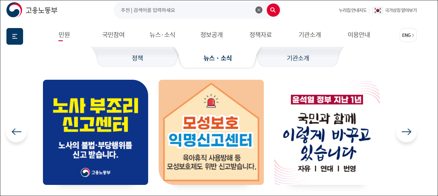 고용노동부 홈페이지 바로가기 안내입니다. 정책뉴스, 정보공개, 통계, 법령, 고용노동 민원신청등의 업무를 제공하고 있으며 해당 사이트 바로가기는 다음과 같습니다.