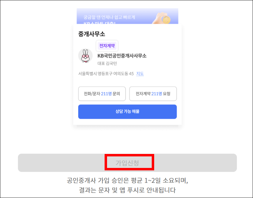 - 공인중개사 가입 승인은 평균 1~2일 정도 소요됩니다. 결과는 문자로 받을 수 있습니다.