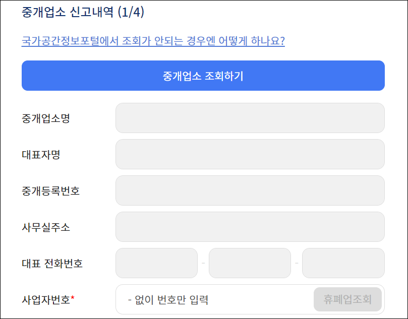 4. 중개업소 조회하기 - 중개업소/대표자명/중개등록번호/주소/전화번호 입력하기