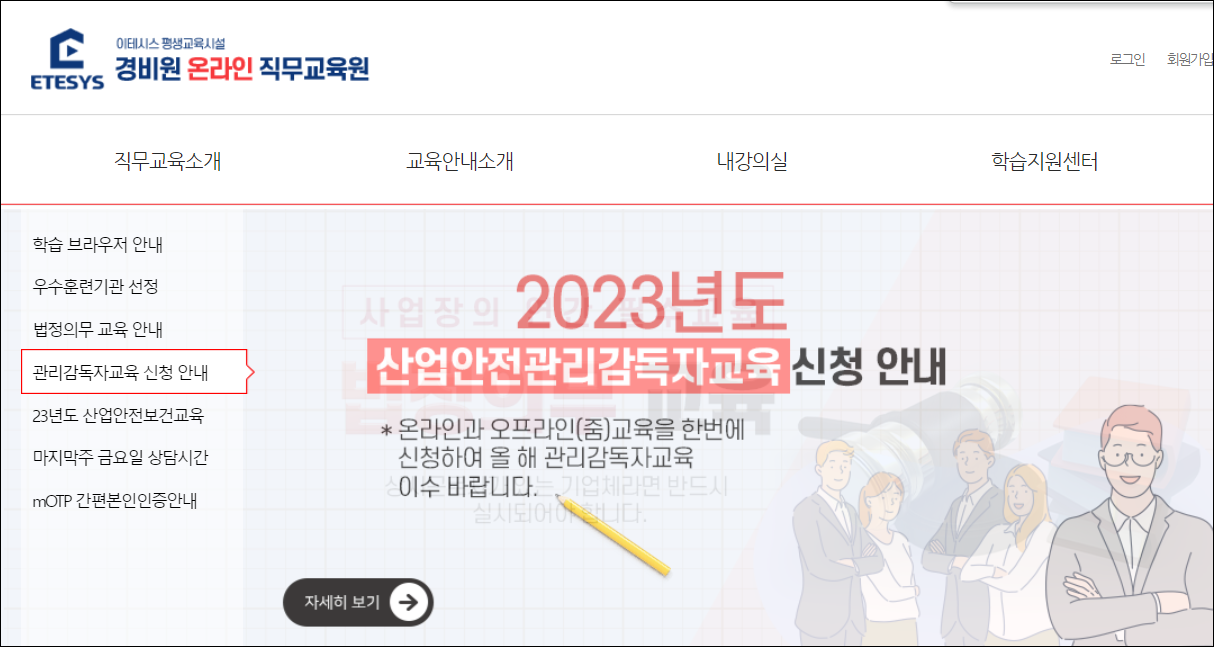 일반경비원은 년48시간, 특수경비원은 년72시간 법정의무교육을 이수해야 하는데요. 온라인 직무교육원에서는 시간과 장소에 구애받지 않고 교육받을 수 있습니다. 해당 사이트 바로가기는 다음과 같습니다.