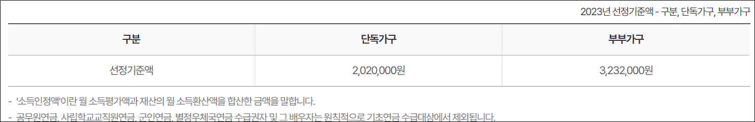 소득인정액은 단독가구일경우 소득인정액이 2,020,000원이하여야 하며 부부가구일경우 3,232,000원이하여야 합니다.