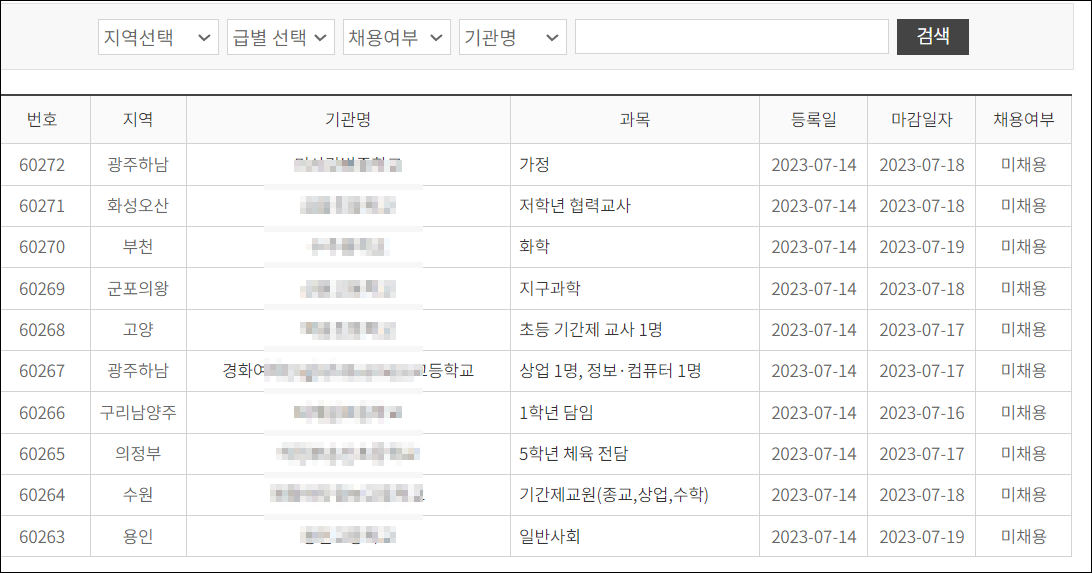 기간제/사립교원, 초중등시간강사, 교육공무직원 등의 채용정보를 제공하고 있는데요. 현재 선생님을 채용중인 학교정보를 확인할 수 있습니다.