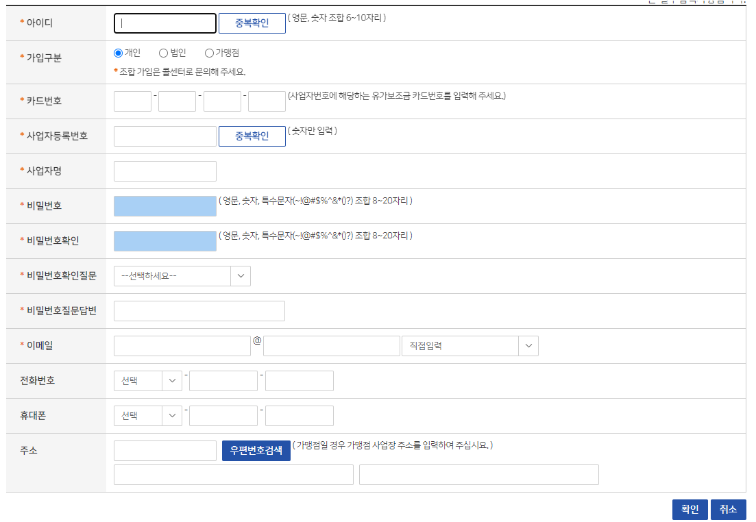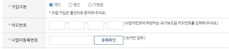 3. 가입구분에서 회원유형을 선택하세요. 사업자번호에 해당하는 유가보조금 카드번호를 입력 후 사업자번호를 입력하세요.
