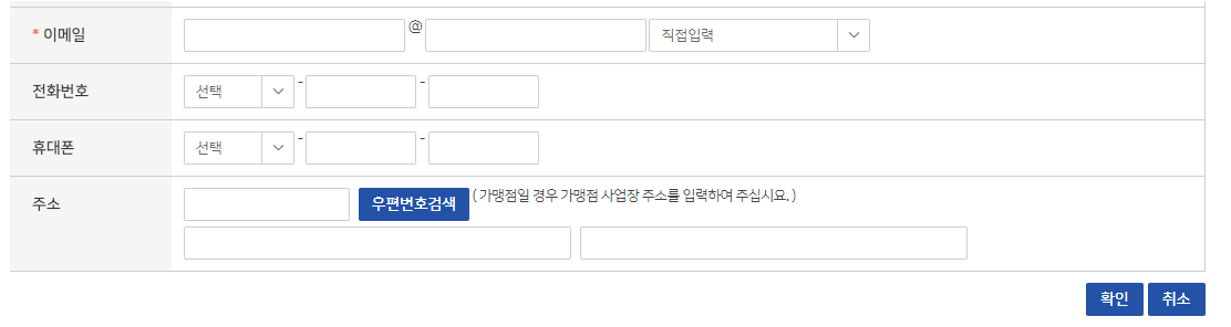 4. 이메일, 전화번호, 휴대폰번호, 주소를 입력 후 회원가입 확인버튼을 클릭하면 회원가입이 완료됩니다.