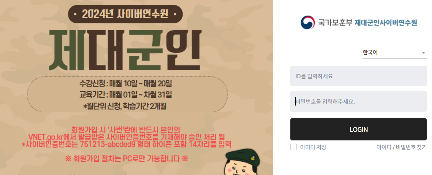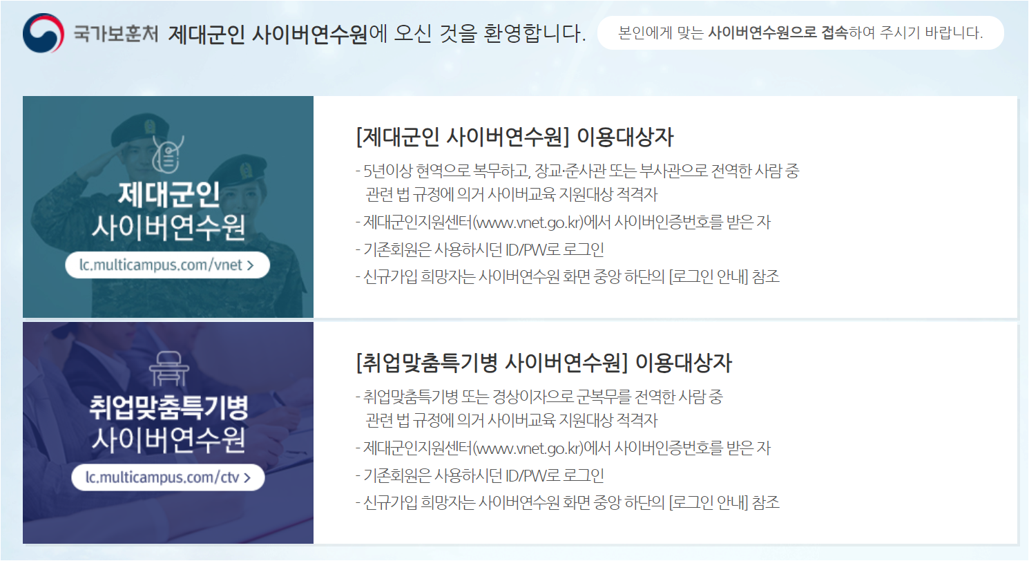 제대군인 사이버연수원은 제대한 군인들의 취업활동을 지원하기 위한 무료 강의를 제공하는 사이트인데요. 5년이상 복무 후 제대한 분이라면 누구나 지원받을 수 있고, 현역으로 복무중인 분들도 5년이상 복무했다면 강의를 수강할 수 있습니다.