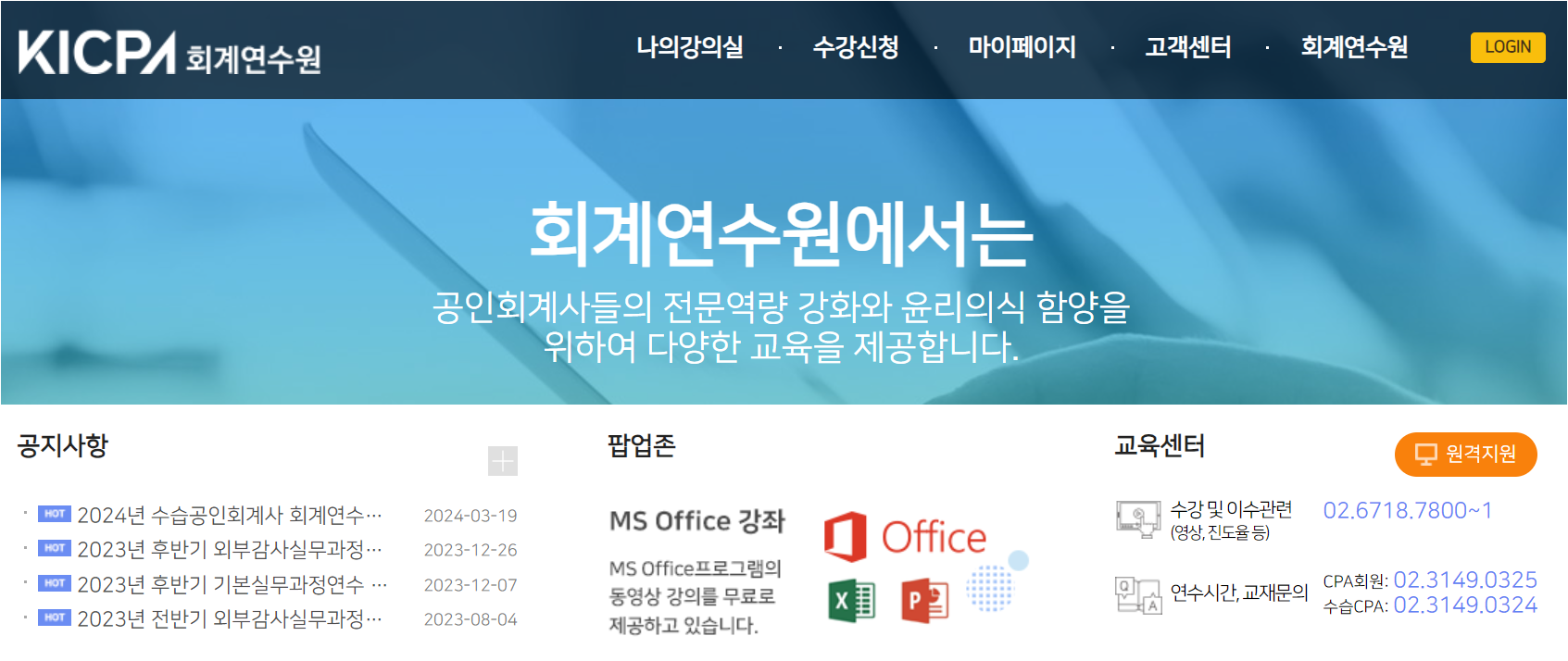 한국공인회계사회 사이버연수원은 공인회계사를 위한 실무교육을 제공하는 사이트인데요. 상속세 및 증여세 실무교육, 공인회계사 윤리기준 해설등의 과정을 제공하고 있습니다. 해당사이트 바로가기는 다음과 같습니다.