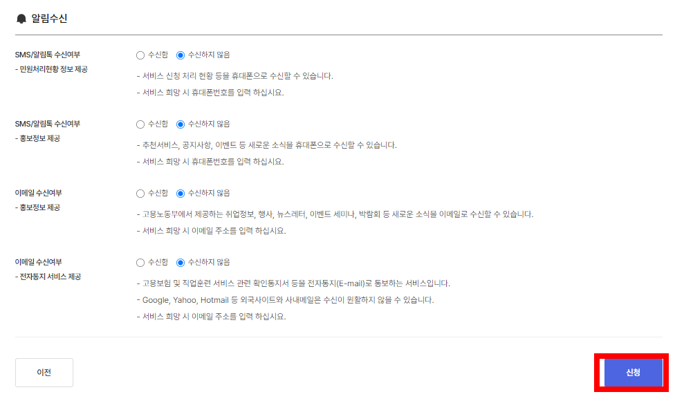 8. 알림수신 여부를 선택하신 후 신청 버튼 클릭시 회원가입이 완료됩니다.