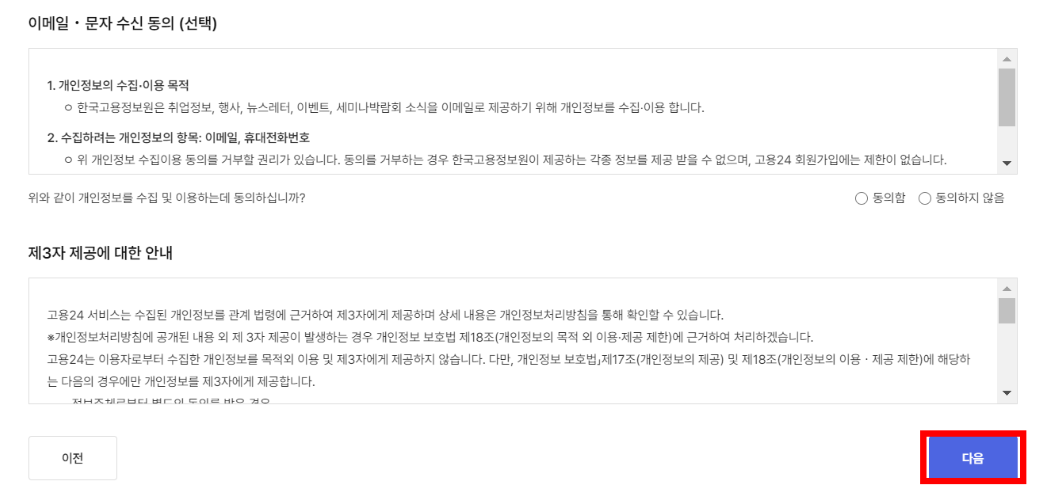 5. 약관 및 개인정보제공에 모두 동의하신 후 다음 버튼을 클릭하세요.