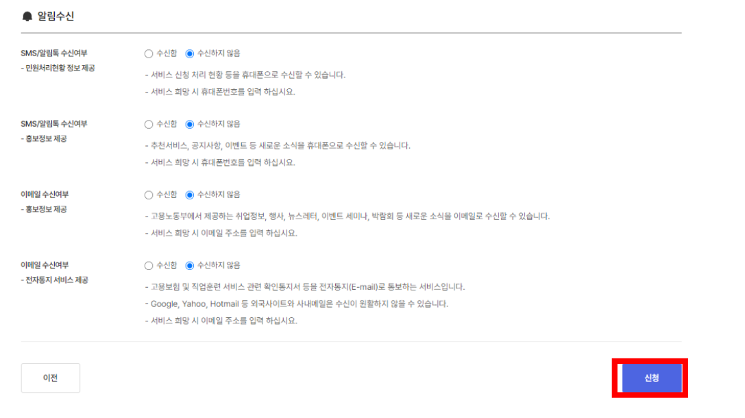 6. 개인정보를 모두 입력하신 후 알림수신을 체크하신 후 신청 버튼을 클릭하면 회원가입이 완료됩니다.