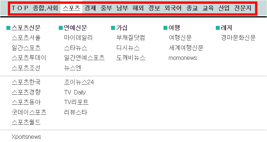 상단에서 제공중인 섹션별 신문사로 보시면 더욱 쉽게 원하는 종류의 신문사를 찾을 수 있습니다. 사회, 스포츠, 경제, 해외, 산업등 원하는 분류를 선택하시면 섹션별 전문 신문사가 제공됩니다.