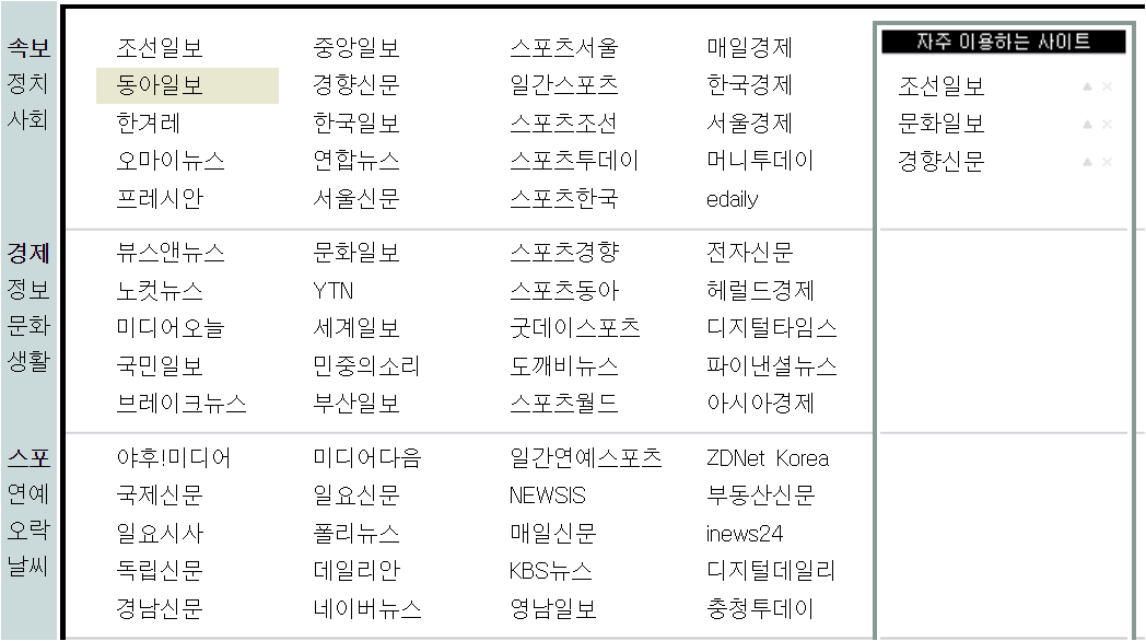 별다른 이용방법이 필요한 사이트는 아닌데요. 신문사 목록이 한눈에 찾아보기 쉽게 정리 되어 있습니다. 신문사 클릭시 해당 신문사 홈페이지로 바로 이동합니다. 정치, 스포츠, 연예, 경제 섹션으로 나뉘어서 원하는 종류의 신문사를 찾기 쉽습니다.