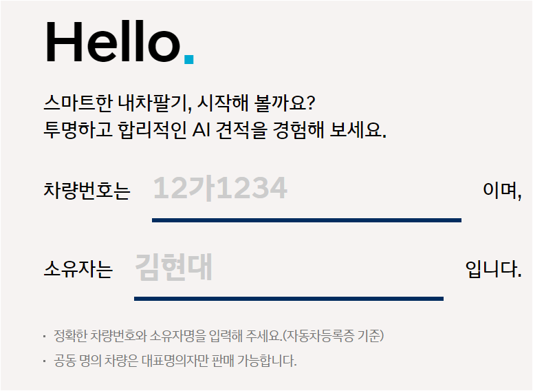 일부 도서산간 지역은 내차팔기 서비스가 제한되거나 차량 인도시 추가 비용이 있을 수 있습니다. 법인 차량도 판매 가능하며 타 브랜드 차량도 판매 가능합니다. 단, 일부 브랜드는 시세 조회가 불가능하여 이용이 불가할 수 있습니다.