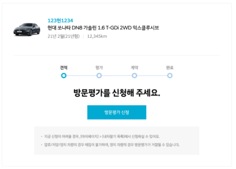 사고 이력이 있는 자동차는 방문신청까지는 받을 수 있지만 사고유형이나 보험액에 따라 판매가 어려울 수 있습니다. 침수 혹은 전수차량, 튜닝차량등의 경우 판매가 불가하니 참고하세요.