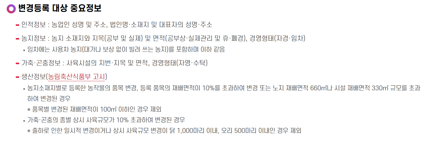 변경등록은 등록된 정보에 변경이 있는 경영체나 등록기관의 확인결과 등록내용이 사실과 다를 때 변경요청을 받은 경영체를 대상으로 합니다. 신청은 등록된 경영체 정보의 변경사항이 발생한 날로부터 14일 이내에 해야 합니다. 변경등록 대상 중요정보에는 인적정보, 농지정보, 가축·곤충정보, 그리고 생산정보가 포함됩니다. 변경등록을 신청할 수 있는 사람은 경영주 농업인이나 법인 대표자이며, 대리신청하는 경우에는 신청인과 대리인의 신분증을 첨부해야 합니다. 변경등록신청서는 등록정보가 변경된 날로부터 14일 이내에 작성하여 방문, 우편, 팩스, 인터넷 등을 통해 관할 사무소에 제출하거나 전화로 신청할 수 있습니다. 변경등록 후 30일 이내에 등록확인서가 발급됩니다.