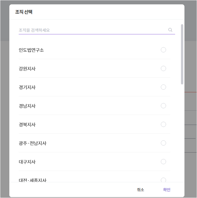 회원가입 시 필수항목으로 조직, 부서, 이름, 아이디, 비밀번호를 입력해야 합니다. 조직은 인도법연구소, 강원지사, 경기지사, 경북지사등등의 조직 중에서 본인이 속한곳을 선택하시면 됩니다.