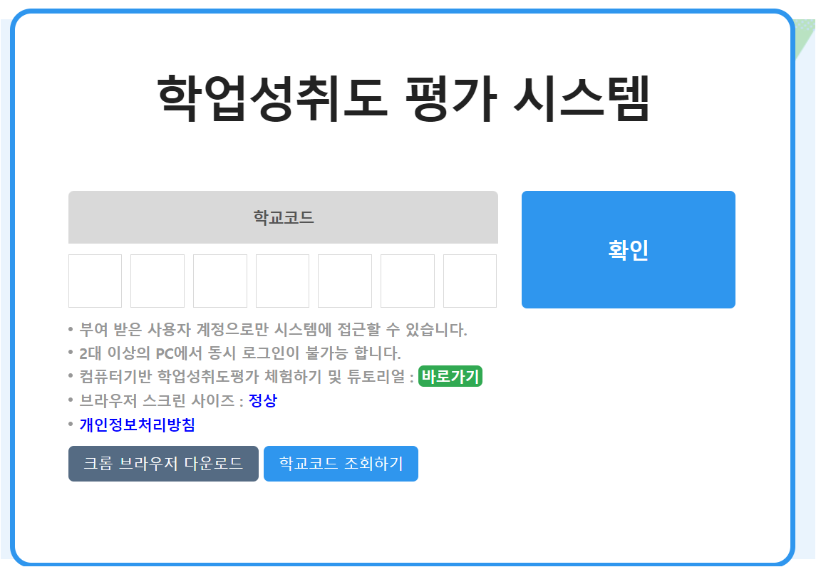학업성취도 평가 시스템은 학생들 학교코드를 입력하여 학업성취도를 평가할 수 있도록 제공하고 있는데요. 홈페이지 주소는 다음과 같습니다.