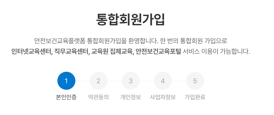 안전보건교육플랫폼의 통합회원가입은 한 번의 절차로 다양한 서비스를 편리하게 이용할 수 있게 해줍니다. 사용자는 먼저 본인을 인증하고, 이어서 서비스 이용 약관에 동의해야 합니다. 그리고 개인정보를 입력하고, 기업 또는 기관 회원으로 가입하기 위해서는 사업자 정보를 제공해야 합니다. 이 모든 과정을 완료하면 사용자는 안전보건교육플랫폼의 회원으로 등록되며, 교육 및 안전보건 서비스를 자유롭게 이용할 수 있습니다.