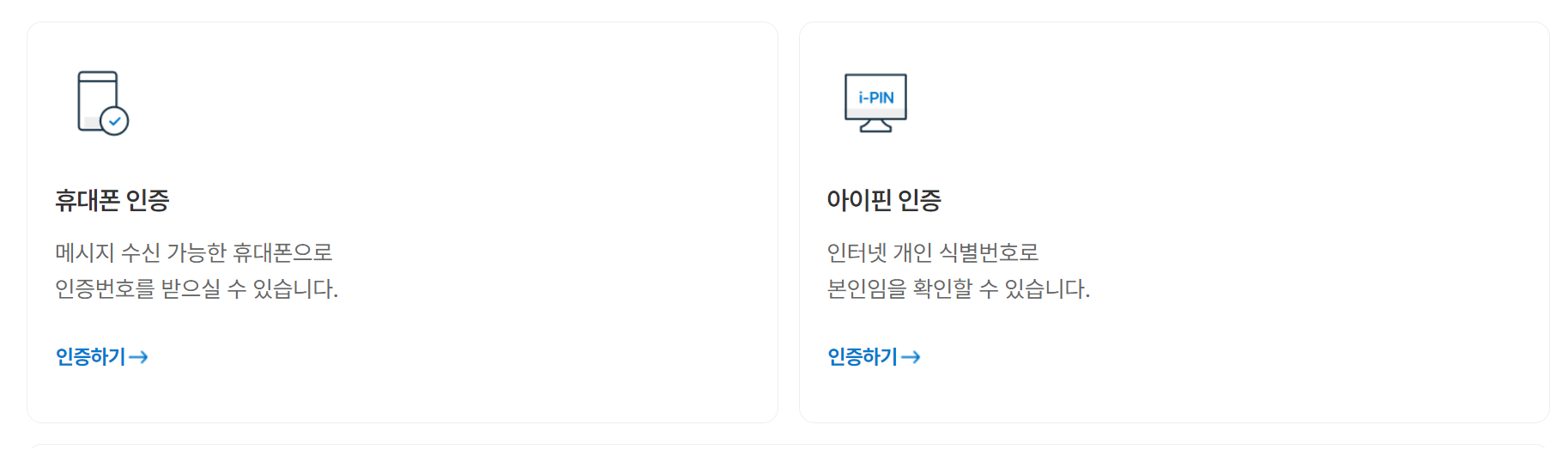 다음은 본인인증을 위한 두 가지 옵션 중 하나를 선택할 수 있습니다. 첫 번째 옵션은 휴대폰 인증으로, 이를 선택하면 본인의 휴대폰으로 전송되는 인증번호를 통해 본인임을 확인할 수 있습니다. 다른 옵션은 아이핀 인증으로, 이를 선택하면 인터넷 개인 식별번호(IPIN)를 활용하여 본인임을 확인할 수 있습니다. 이러한 본인인증 과정에서 사용되는 개인정보는 안전하게 관리되며, 플랫폼은 별도로 이를 저장하지 않습니다.