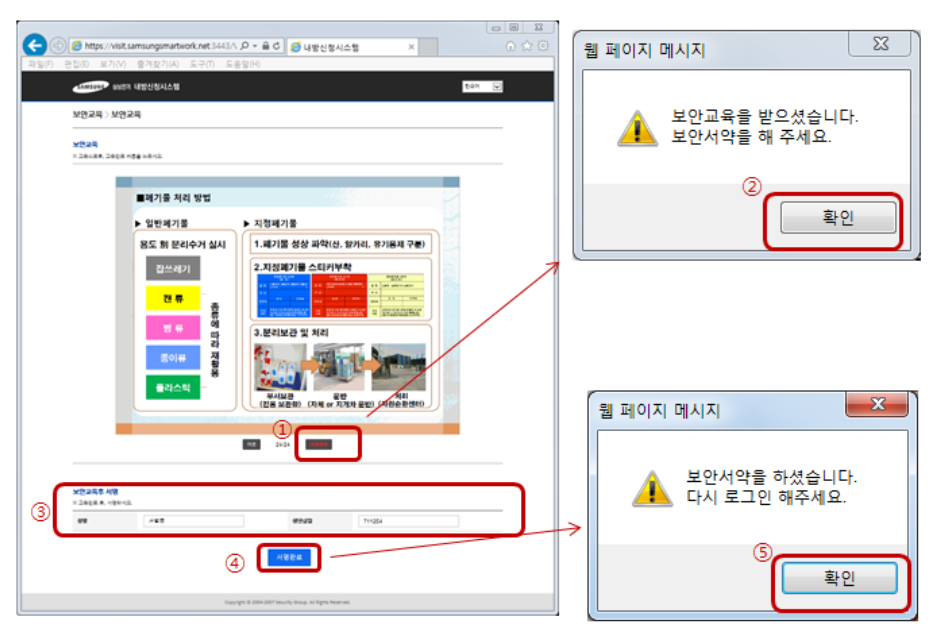 4. 내방객의 보안 및 안전교육을 모두 완료하세요. 보안 및 안전교육을 모두 이수하면 보안서약을 해야 합니다. 보안서약까지 모두 완료하시면 가입이 완료되며 로그인 가능합니다.