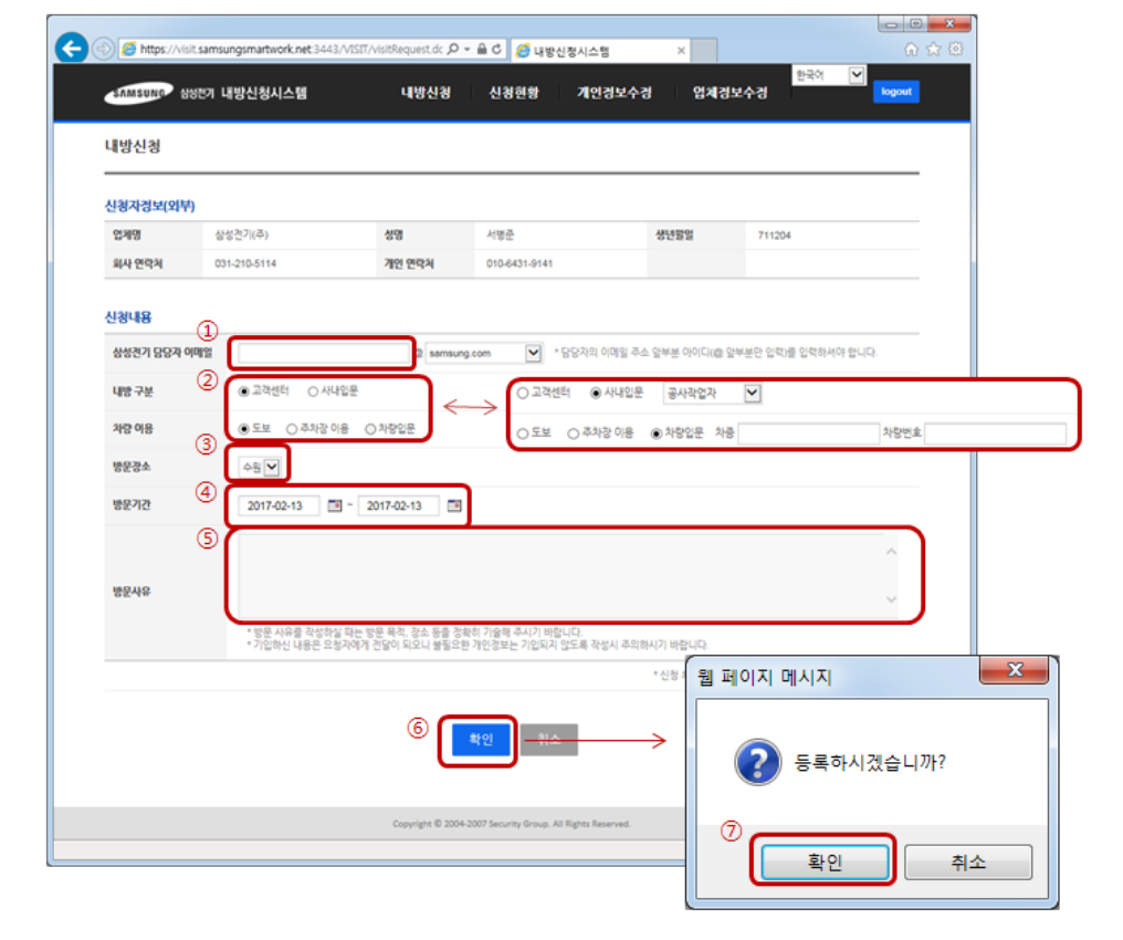 5. 메인화면에서 로그인하신 후 내방정보를 입력해야 하는데요. 전기 담당자 이메일을 입력한 후 내방구분 및 차량정보를 입력하세요. 마지막으로 방문사업장 및 기간, 사유를 입력하신 후 확인을 클릭하여 등록하시면 내방신청이 완료됩니다.