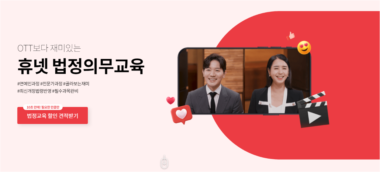 휴넷은 고용노동부 지정기관으로 법정의무교육 공식 위탁기관입니다. 법정교육 필수과정을 완비하였으며 자체 제작된 컨텐츠를 제공하여 쉽게 이해할 수 있도록 온라인 교육을 이수할 수 있도록 제공하고 있습니다.