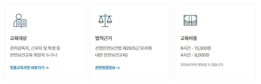 인터넷교육센터에서는 관리감독자, 근로자, 학생등 누구나 안전보건교육을 이수할 수 있으며 교육비용은 8시간 15,000원, 4시간 8,000원입니다.