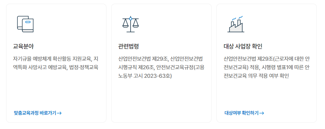 안전보건공단 교육은 경영층 교육, 중간관리자교육, 노동자 교육이 제공되고 있는데요. 자기규율 예방체계 확산활동 지원교육, 지역특화 사망사고 예방교육, 법정·정책교육맞춤교육과정등이 있습니다.