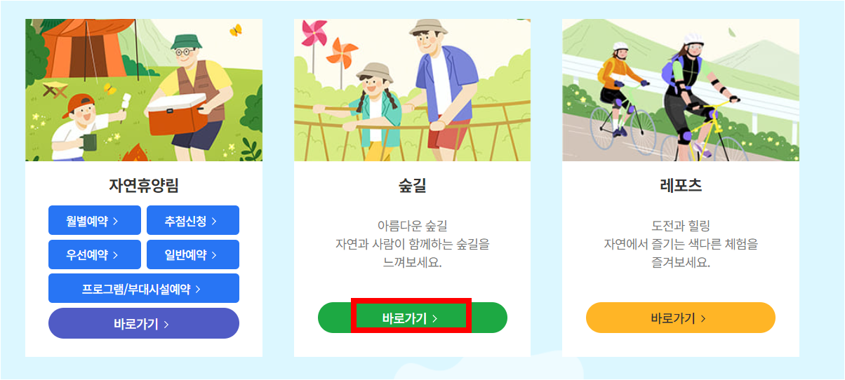 예약을 하시려면 메인홈페이지에서 숲길 바로가기를 선택하셔야 합니다.