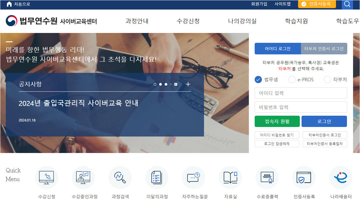 법무연수원을 이용하기 위해서는 회원가입을 완료해야 하는데요. 회원가입시 지자체 공무원이 인증서를 이용하여 타부처 지자체 공무원이 인증서를 통해 가입해야 합니다. 법무부 및 검찰청 직원은 별도 회원가입 및 승인절차 없이 이용가능하며 단, 최초 로그인시 직렬과 소속등의 정보를 입력해야 합니다.