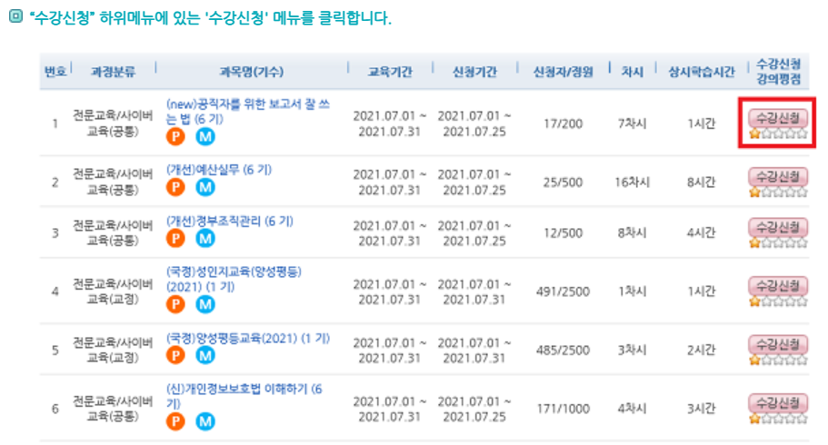 수강신청은 로그인 후 수강신청 메뉴를 클릭한 후 개설중인 과정중 듣고 싶은 강의를 선정하여 수강신청 버튼을 클릭하면 됩니다.
