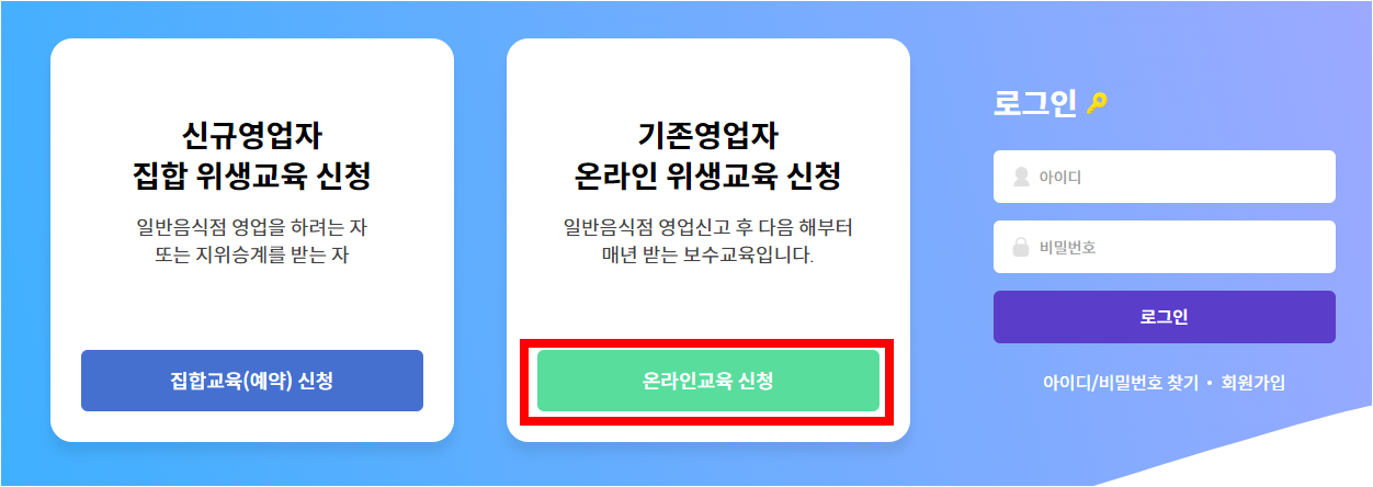 한국요식업중앙회 위생교육은 신규음식점 영업자와 기존영업자 위생교육을 받을 수 있도록 제공중인데요. 신규인경우 집합교육을 기존음식점 영업자는 매년 1회 온라인 보수교육을 받아야 합니다. 홈페이지 바로가기는 다음과 같습니다.