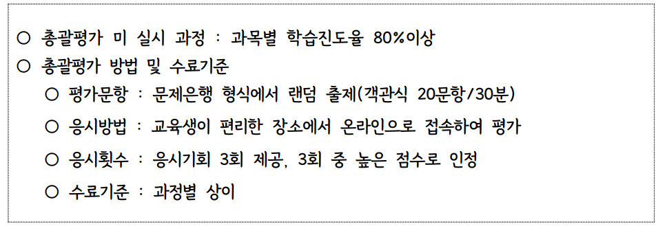 총괄평가에서 교육생이 일정 점수 이상을 획득해야 수료 조건을 충족합니다. (구체적인 점수 기준은 제공된 정보에 포함되지 않아 명시되지 않았습니다.)