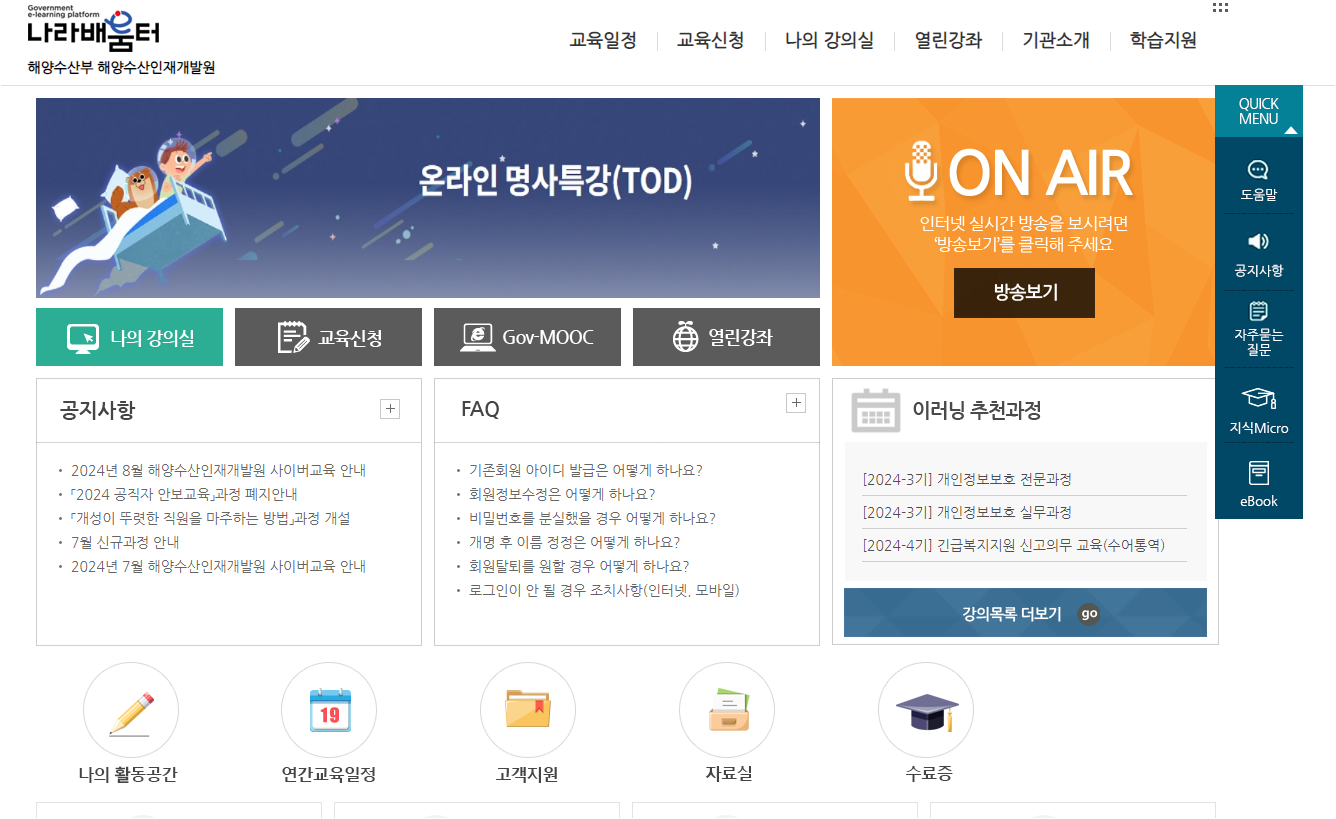 해양수산인재개발원 사이버교육센터는 해양수산 관련 공직자를 위한 이러닝교육과 직무교육을 제공하는 사이트인데요. 홈페이지 바로가기는 다음과 같습니다.