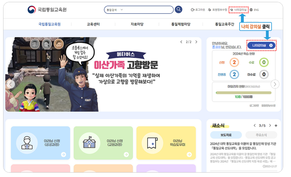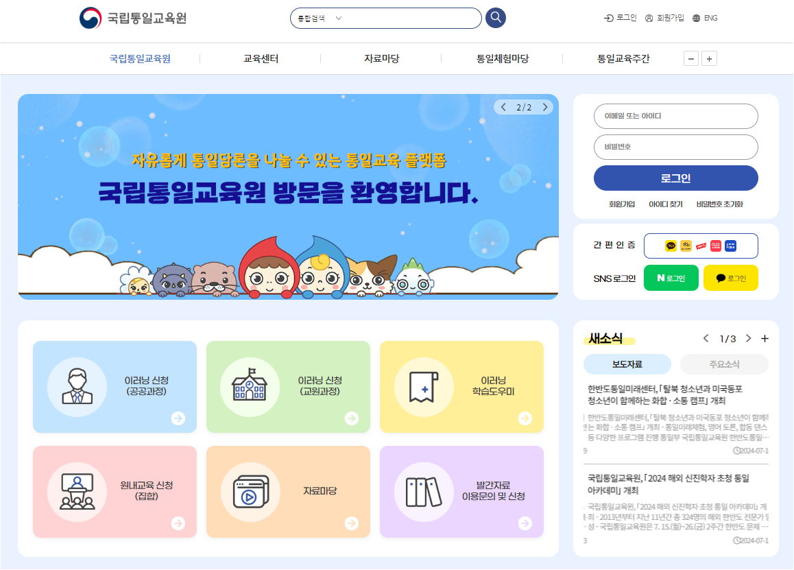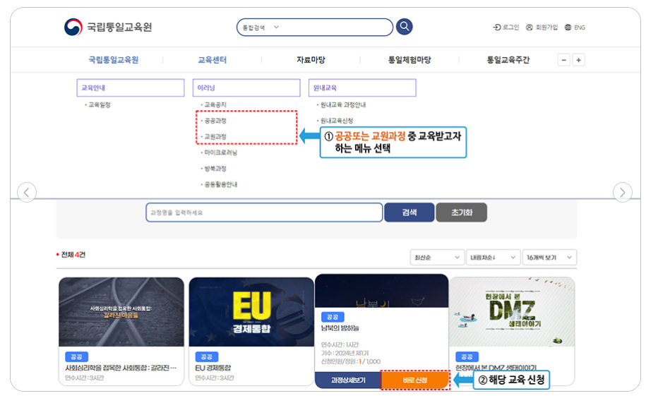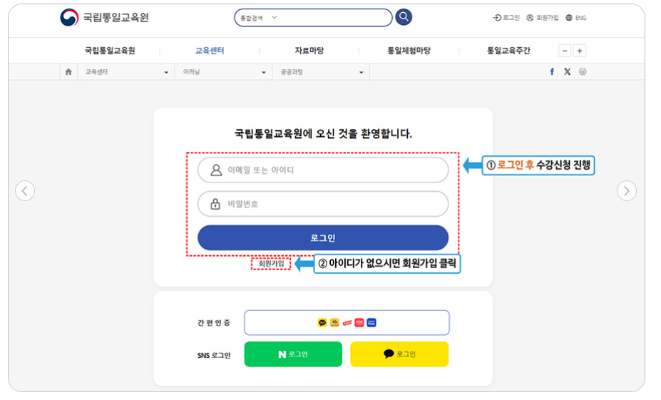 1. 국립통일교육원 누리집(http://www.uniedu.go.kr) 에서 회원가입 후 수강신청하시면 됩니다.