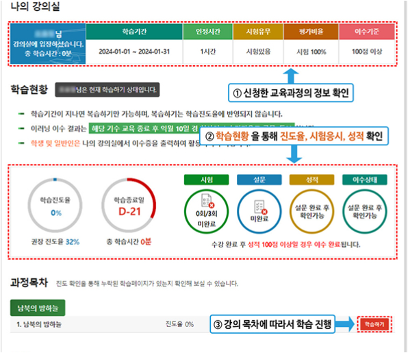 7. 나의강의실에서 신청한 교육과정을 확인하고 학습현황에서 진도율, 시험응시, 성적등을 확인가능합니다.
