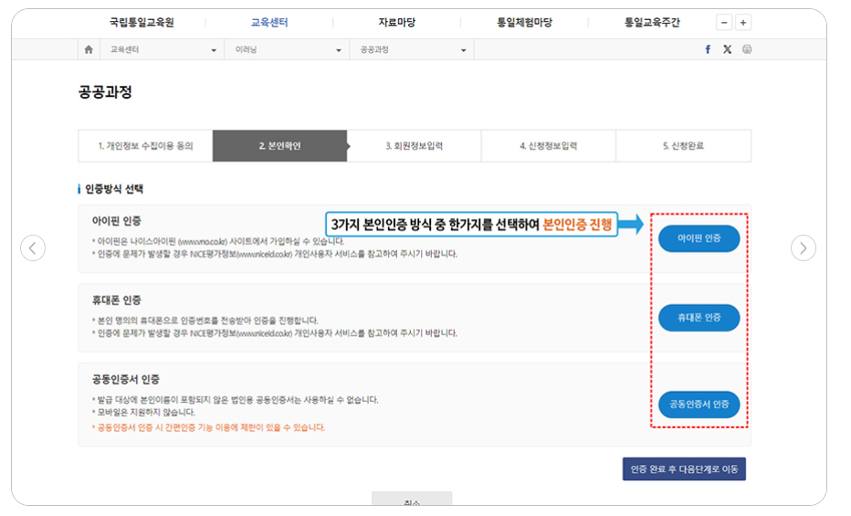3. 회원가입 시 약관에 모두 동의하신 후 아이핀인증, 휴대폰인증, 공동인증서 인증 중에서 선택하여 본인인증을 완료해야 합니다.