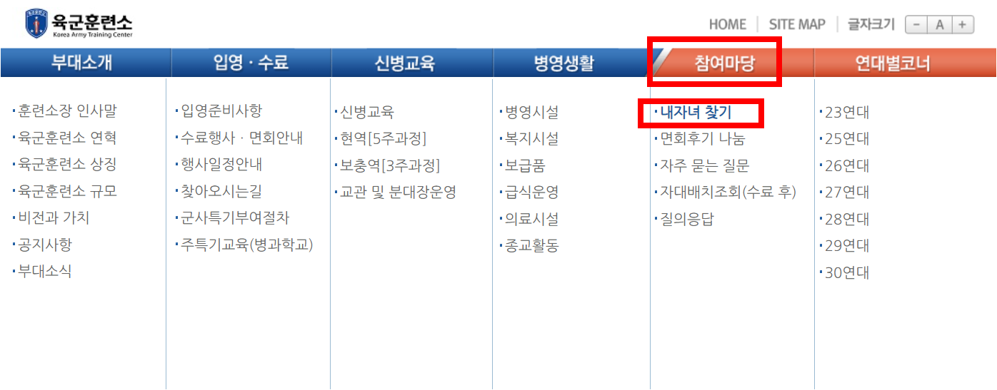 홈페이지에 접속한 후, 상단 메뉴에서 '참여마당' 메뉴를 선택하신 후 내자녀찾기 메뉴를 선택하세요.